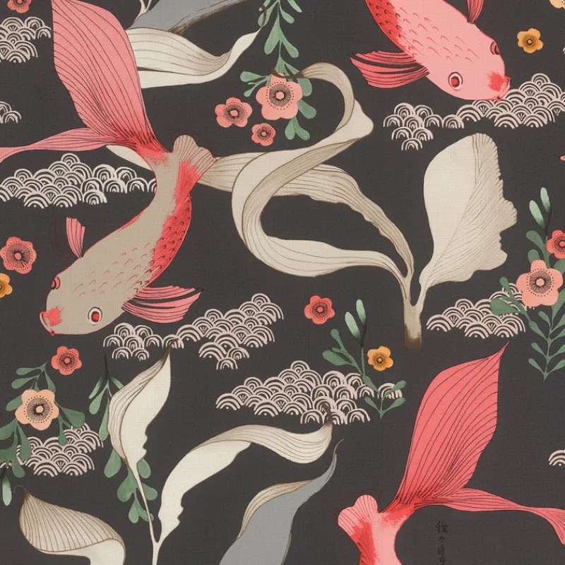 Add a spark of magic to your interiors with this whimsical wallpaper! Large-scale fish seem to swim through land and sea, the stylized illustrations featuring both seaweed and flowers. The design’s vibrant pinks and soothing beige hues are richly offset by a charcoal faux linen backdrop. Dai is an unpasted, vinyl on non woven wallpaper.