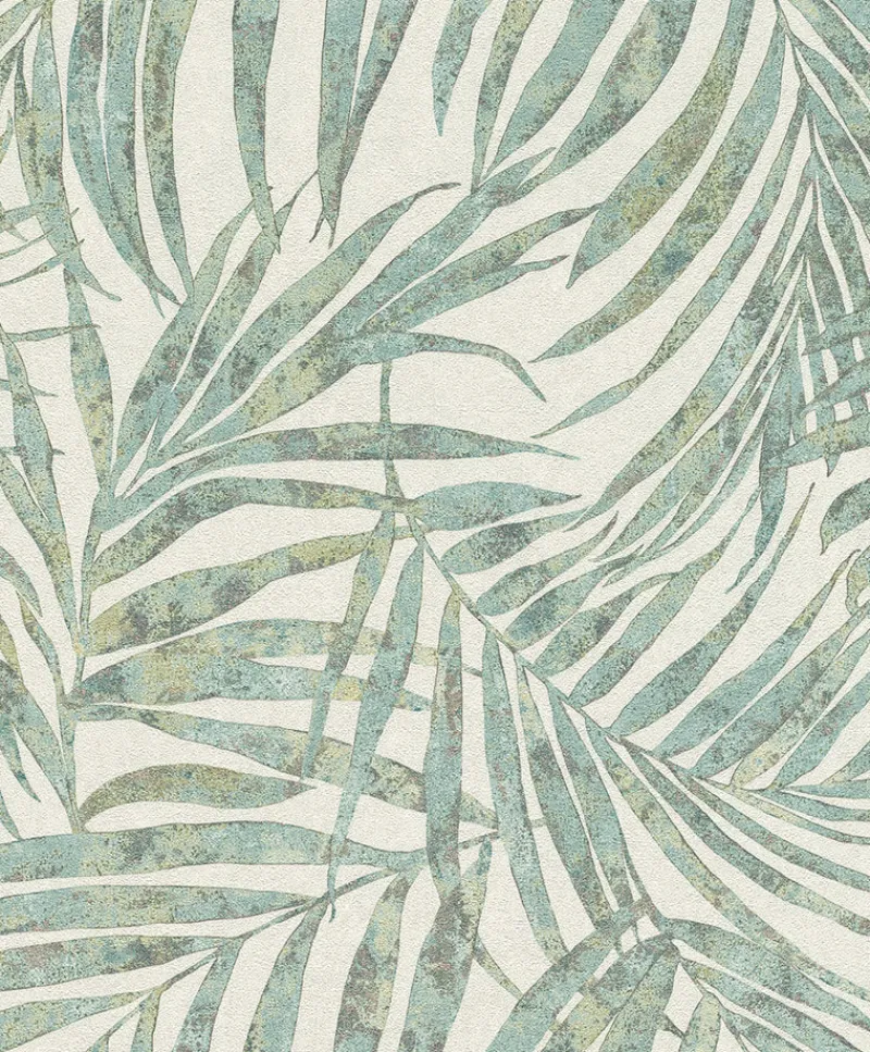 Bring earthen elegance to your interiors with this colorful frond design. Each palm leaf is inked with a fusion of teal and green hues against an off-white backdrop, raised inks creating stucco-like texture throughout the design. Anzu is an unpasted, vinyl on non woven wallpaper.