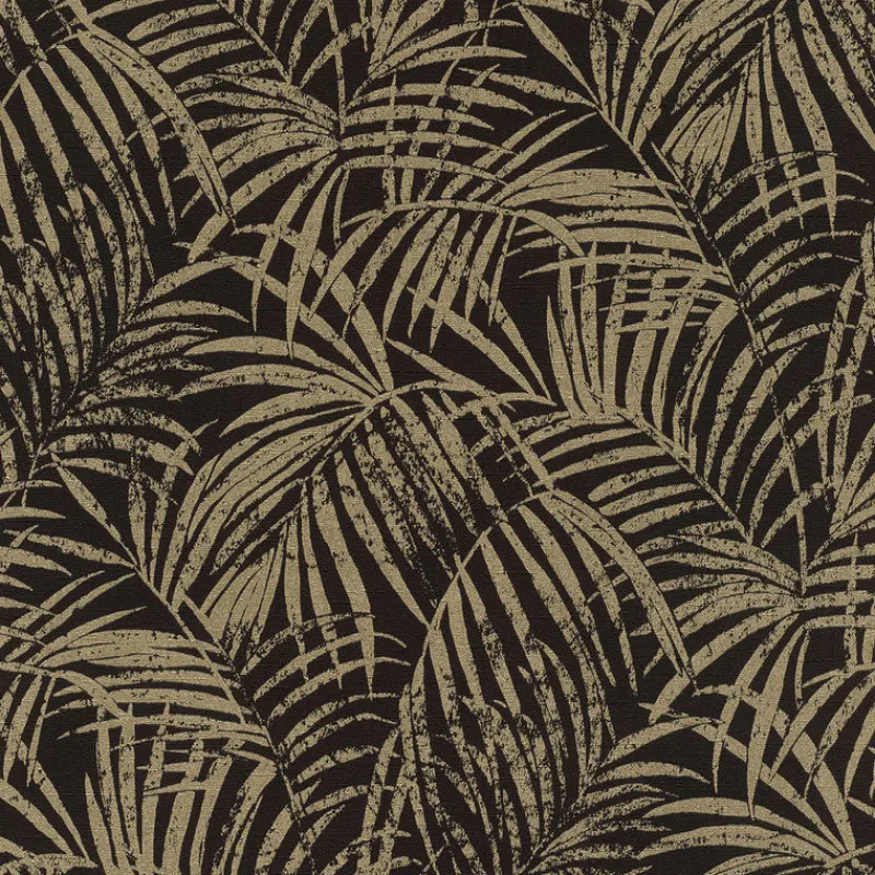 Tropical with a touch of glamour, this palm leaf wallpaper is a luxurious way to finish your walls. The black faux linen backdrop adds dimension to the shimmering gold palms layered on top. Yumi is an unpasted, vinyl on non woven wallpaper.