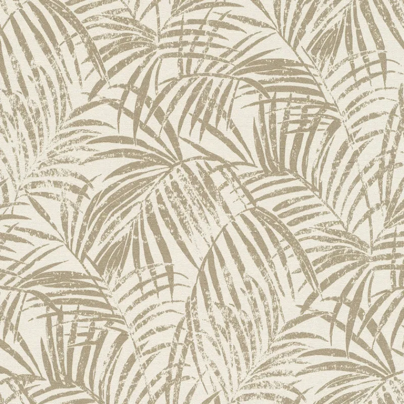 Bring tropical luxury to your home with this calming yet chic palm design. Each frond is infused with a golden shimmer that softly shines against the creamy faux linen backdrop. Yumi is an unpasted, vinyl on non woven wallpaper.