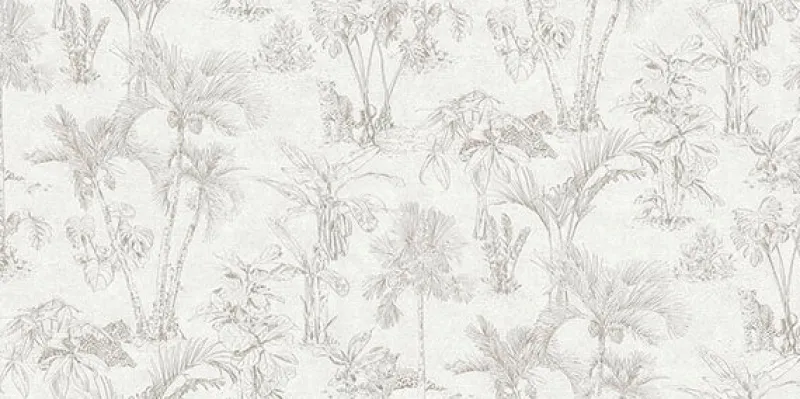Bring sophisticated jungle flair to your walls with this illustrative tropical design. Jaguars peer out from the rich rainforest vegetation, the details inked in grey against an off-white faux linen backdrop. Zapata is an unpasted, vinyl on non woven wallpaper.