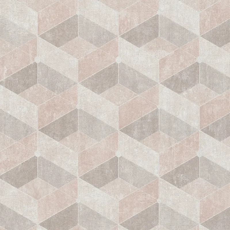 Enjoy a modern take on tiled design with this geometric wallpaper. Featuring an array of soft blush, taupe, and muted mauve, each shape is delicately outlined in a pearlescent white. Muir is an unpasted, vinyl on non woven wallpaper.