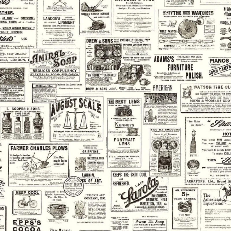 Go back in time with this vintage newspaper wallpaper. With a faded black print and crisp white background, this novelty design features ads for goods like bicycles, pianos, and cologne. Alden is a prepasted, coated heavyweight paper wallpaper.