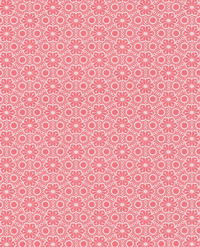 Youll always feel happy walking into a room decorated with this wallpaper! The neon coral has a subtle sheen underneath off-white raised ink that forms a kaleidoscope pattern of flowers and dots.