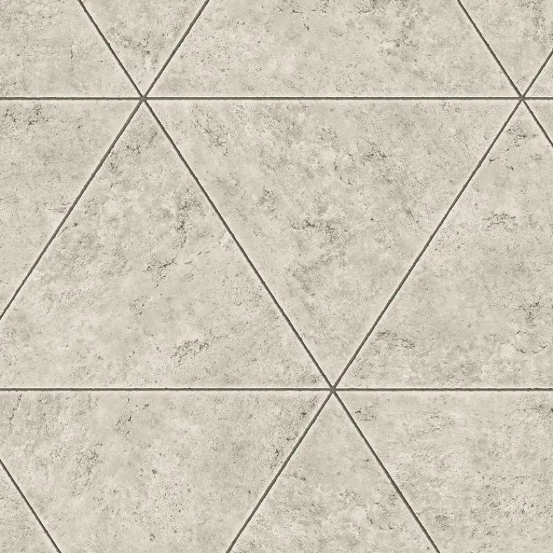 Off-white tiles are designed with a grey printed texture to give the look of polished concrete. The large-scale triangle pattern is contemporary and eye-catching. Dark faux grout lines add contrast.