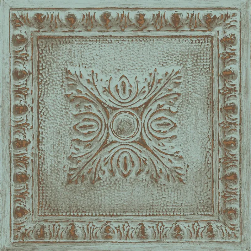 A stunning combination of muted turquoise and copper. The metallic accents highlighting parts of the tin tiles’ design are eye-catching and modern. This large-scale pattern will add a realistic effect to walls.