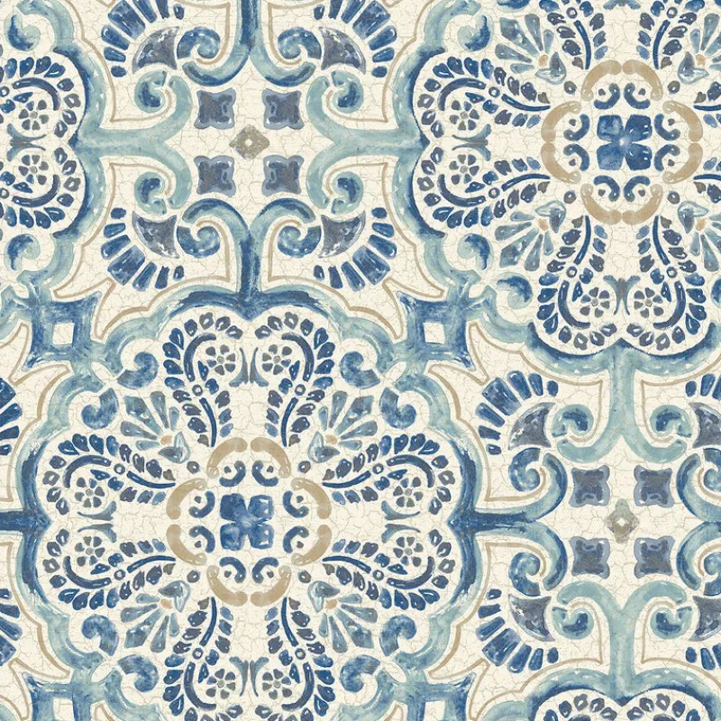 A stunning Moroccan pattern with a Florentine flair. The blue and taupe design appears hand-painted onto a crackled surface in pearlescent ivory. Printed in a large-scale, this wallpaper’s vintage tile look is given a modern update.