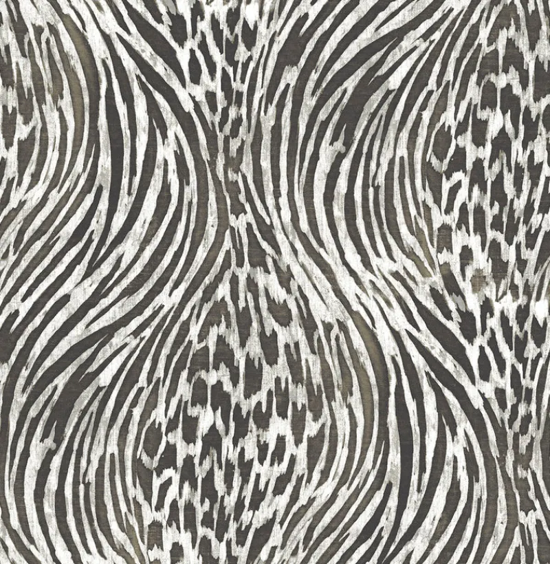 This wallpaper celebrates the magnetism of animal prints with a classic ogee motif. Touches of metallic platinum add texture to the black and grey pattern.