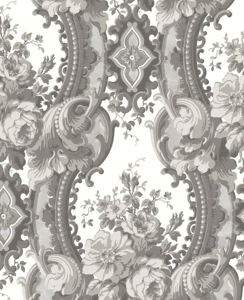 A large-scale floral damask that has hints of old world elegance with modern intrigue. Surface printing adds texture to the tonal grey pattern.
