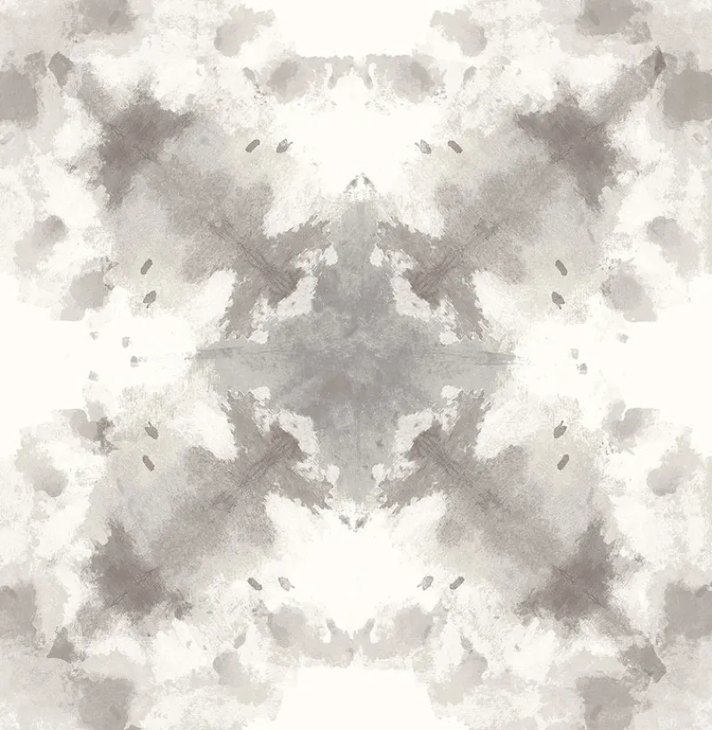 This wallpaper features a watercolor kaleidoscope pattern. The modern print is done in subdued taupes and greys.