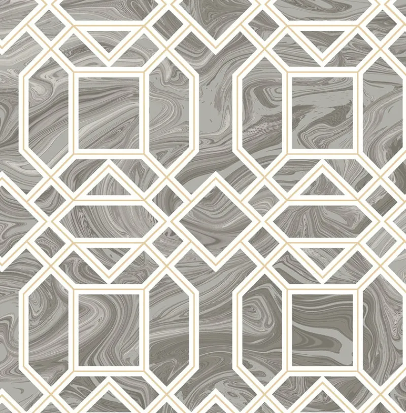 Captivating swirls of grey marble are the canvas for this modern wallpaper. A white trellis pattern is detailed with metallic gold for a touch of shine.