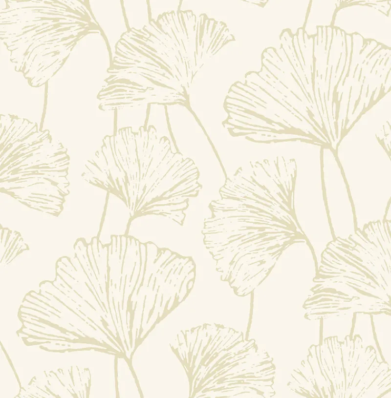 White and soft gold look lovely together in this botanical wallpaper. Ginkgo leaves catch the light with metallic ink over a white background. Reverie is a unpasted, non woven wallpaper.