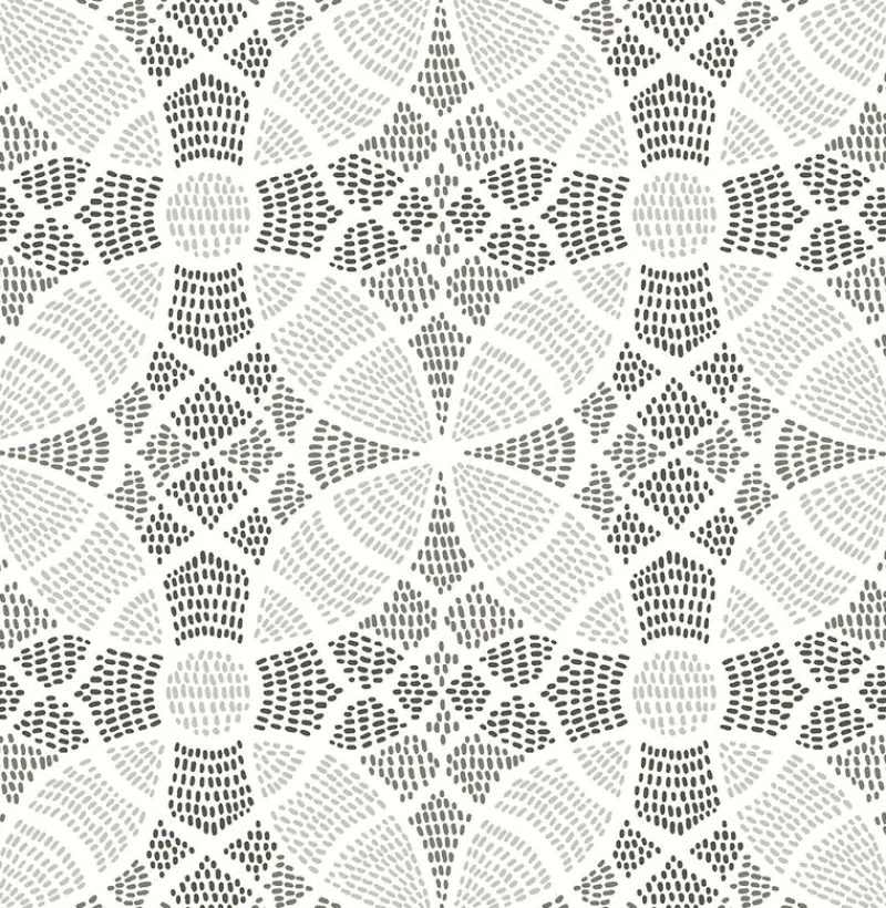 An abstract floral pattern is created by overlapping shapes filled with dark taupe, black, and grey dots. The grey sections are printed with raised ink for a textural feel. Zazen is a unpasted, non woven wallpaper.