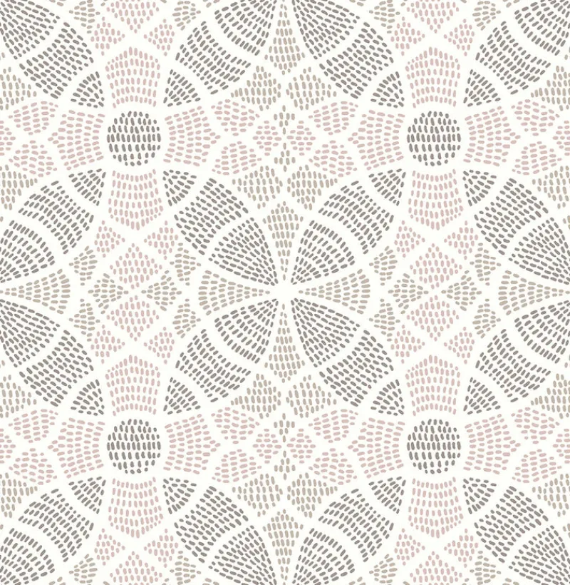 Dotted brushstrokes of dusty rose, dark mauve, and warm taupe creates an abstract floral pattern. Raised ink gives the dark mauve sections an extra pop. Zazen is a unpasted, non woven wallpaper.