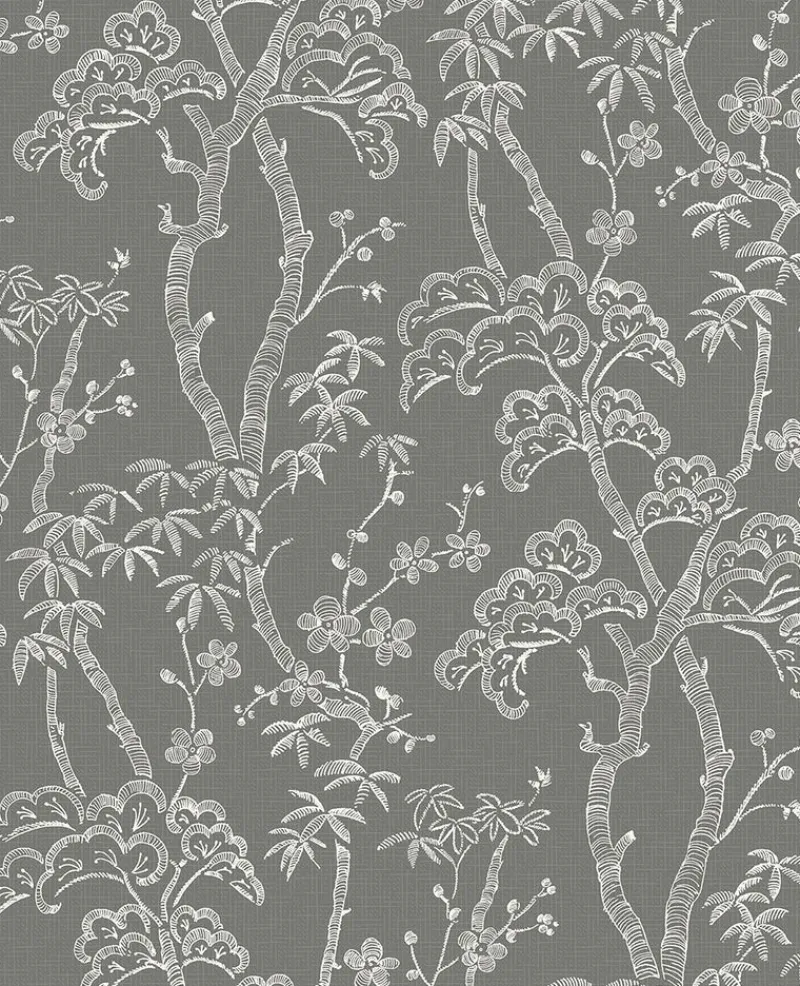 Whimsical trees are printed in raised white ink, giving this wallpaper a textural feel. A subtle grid-like print adds depth to the grey background. Bonsai is a unpasted, non woven wallpaper.
