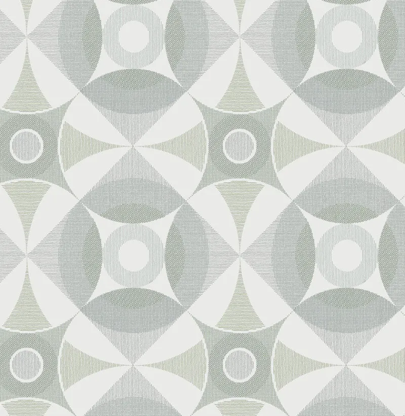 Overlapping circles with striped designs dazzle in this kaleidoscope print. Its sage, green and slate hues add an organic touch to this contemporary wallpaper. Ellis is an unpasted, non woven wallpaper.
