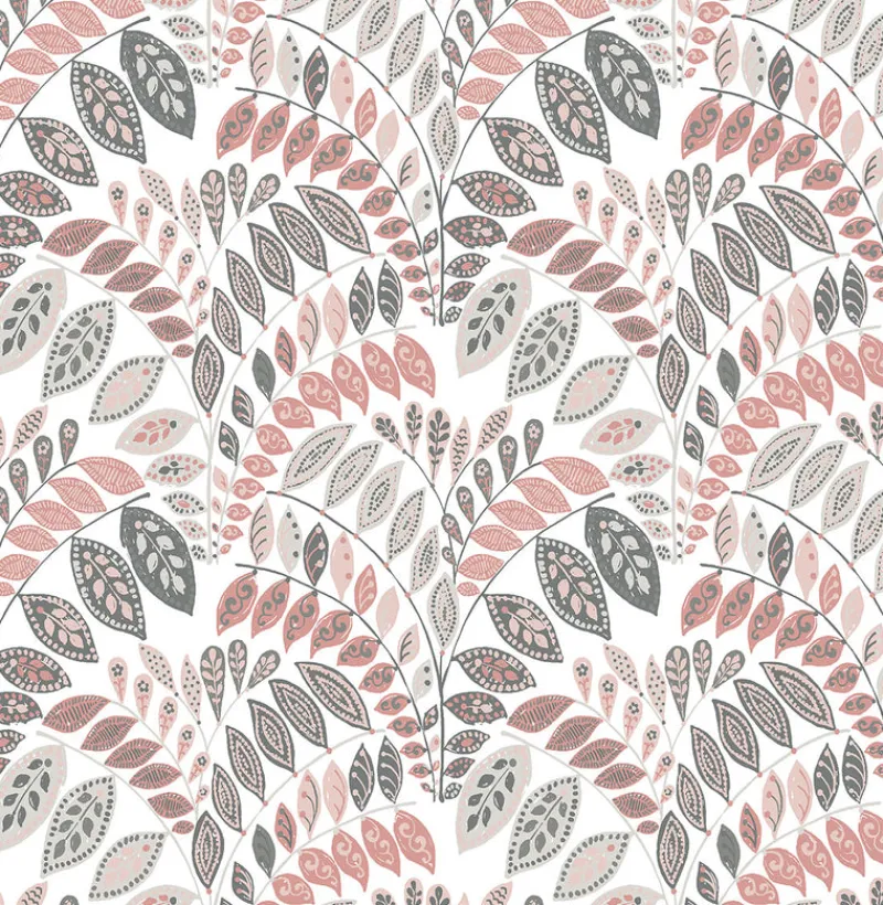 Beautiful rose, blush and charcoal leaves spring from furling fronds in this whimsical design. With intricate geometric accents, this Scandinavian wallpaper has a contemporary edge. Fiddlehead is an unpasted, non woven wallpaper.