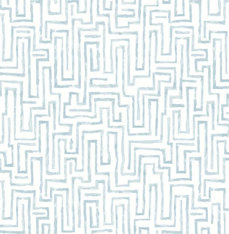 A blue geometric pattern slinks its way across a crisp white background. Its watercolor style adds a whimsical touch to its unique and modern look. Ramble is an unpasted, non woven wallpaper.
