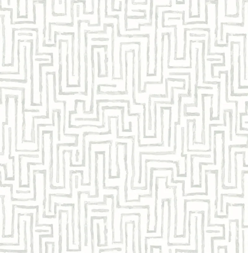 With a watercolor style, this geometric wallpaper has a unique and fresh look. Its light grey pattern weaves across a crisp white background. Ramble is an unpasted, non woven wallpaper.