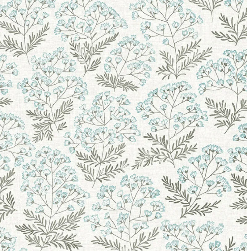 Delicate blue flowers blossom from grey sprigs in this nature inspired wallpaper. Its faux linen background creates a dimensional look. Floret is an unpasted, non woven wallpaper.