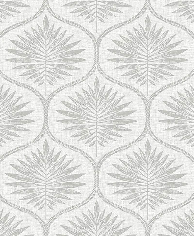 A light grey ogee print curls against a linen inspired background in this Scandinavian wallpaper. Block print leaves lend to its Nordic style. Laurel is an unpasted, non woven wallpaper.