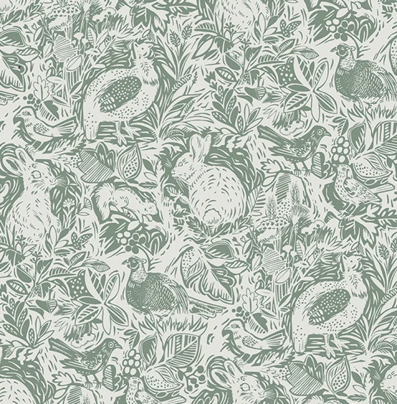 Darling rabbits, curious birds and squirrels frolic among enchanting plants and flowers in this whimsical design. Its dark green pattern effortlessly complements a crisp white background. Revival is an unpasted, non woven wallpaper.