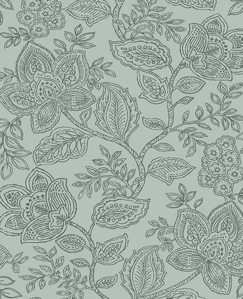 Bohemian meets modern with this fresh take on a Jacobean floral design. Its dark green botanical print pops with raised inks against a muted green background. Larkin is an unpasted, non woven wallpaper.