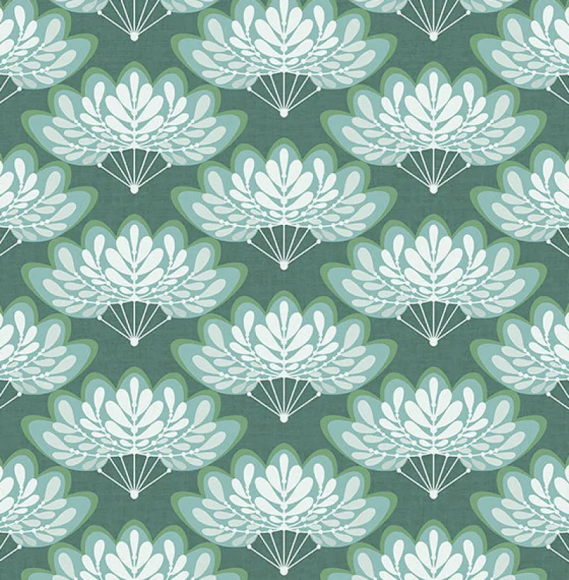With a palette of teal, green and grey hues, this floral wallpaper has an organic energy with a glamorous edge. Its fabric inspired background creates a dimensional look. Lotus is an unpasted, non woven wallpaper.