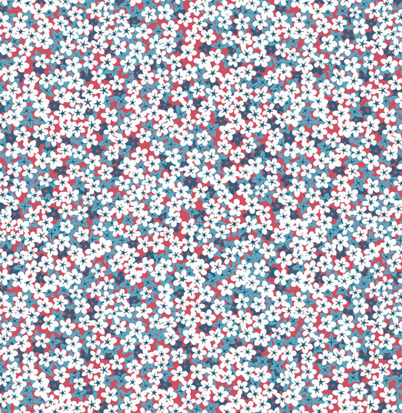 Navy, blue and white miniature flowers pop against a vibrant red background. Its layered design creates a dimensional and hypnotizing effect. Giverny is an unpasted, non woven wallpaper. Shop Perennial by A Street Prints at The Fabric Co. today!