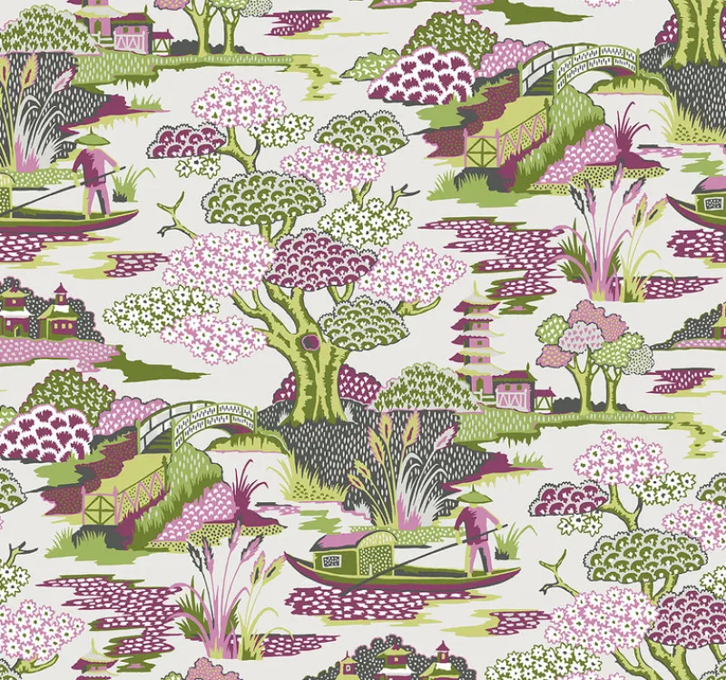 Filled with bridges, pagodas, and fishing boats, this toile design depicts a lush landscape. Vibrant lime, deep magenta and mauve hues add a modern edge to this traditional print. Joy De Vie is an unpasted, non woven wallpaper. Shop Perennial by A Street Prints at The Fabric Co. today!