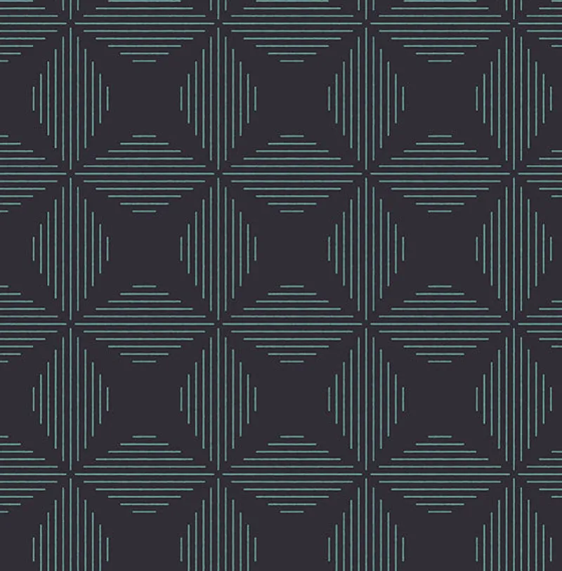 A navy backdrop accentuates the teal lines that comprise this unique diamond geometric. Its chic and modern design will make a bold statement in any room. Telestar is an unpasted, non woven wallpaper. See pattern 2902-25508 on page 65 and order a sample today!