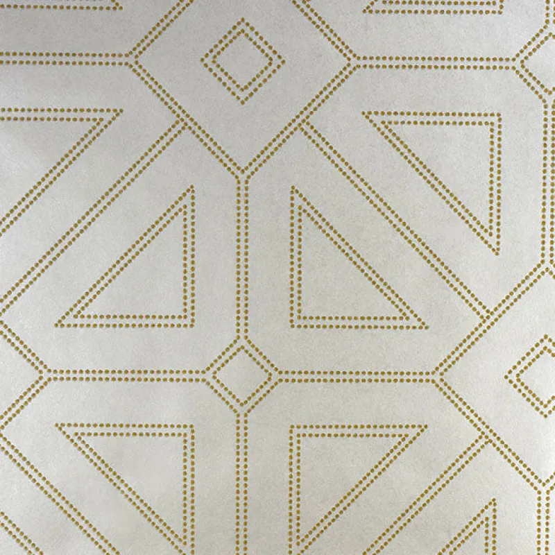 An absolutely stunning wallpaper. Gold beaded dots create a dazzling geometric pattern a top a gleaming ivory background. Voltaire is an unpasted, non woven wallpaper. See pattern 2902-87335 on page 24 and order a sample today!