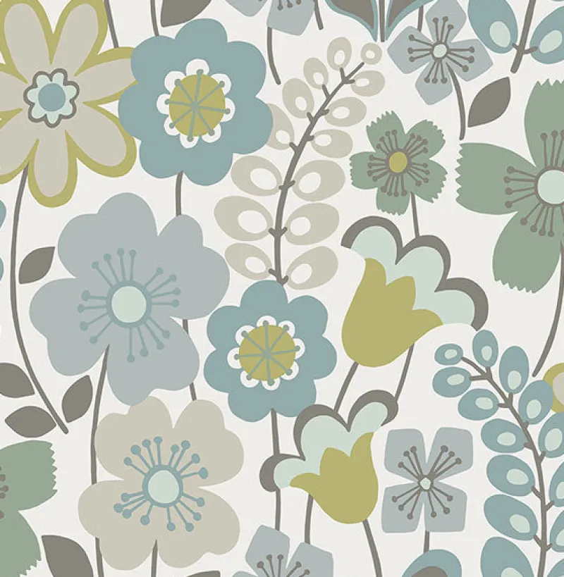 Charming and sweet, this modern floral wallpaper has an eclectic flair. Charming botanicals pop against an off-white background in various green, blue and taupe hues. Piper is an unpasted, non woven wallpaper.