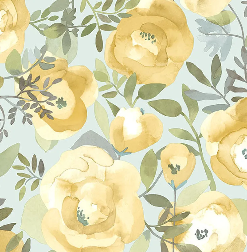 Create a dreamy and romantic look with this vintage inspired wallpaper. In a watercolors style, mustard and yellow flowers flutter about curling leaves and an icy blue background. Orla is an unpasted, non woven wallpaper.