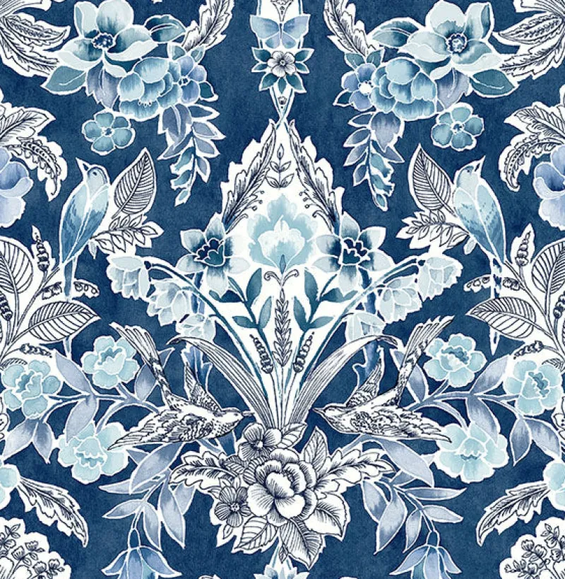 Bold yet delicate, this vintage inspired wallpaper features a damask print complete with charming birds and beautiful flowers. Its watercolor style effortlessly complements a palette of off-white and various blue hues. Vera is an unpasted, non woven wallpaper.