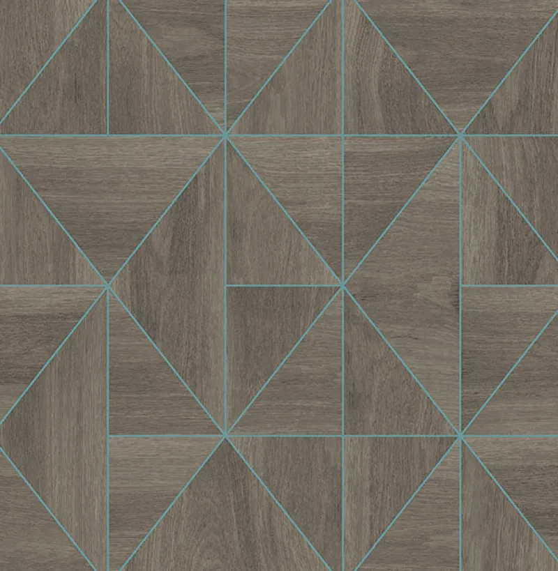 Esteemed and refined, this wood inspired wallpaper has a modern flair. A shimmering blue geometric pattern effortlessly complements a rich brown background, while raised inks lend to its realistic look. Cheverny is an unpasted, non woven wallpaper. Shop 2908-25322 from The Fabric Co. for your walls today!