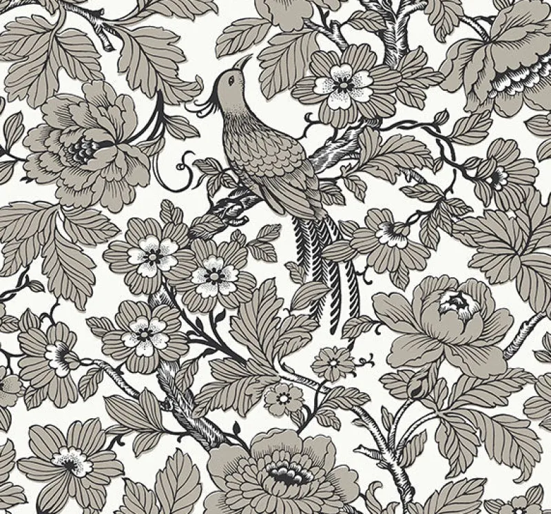 This stunning chinoiserie wallpaper is traditional elegance with a modern touch. A bird perches among the limbs of a flowering tree, simply illustrated with strong black lines and shaded with taupe against a creamy white backdrop. Beaufort is an unpasted, screen acrylic coated wallpaper.