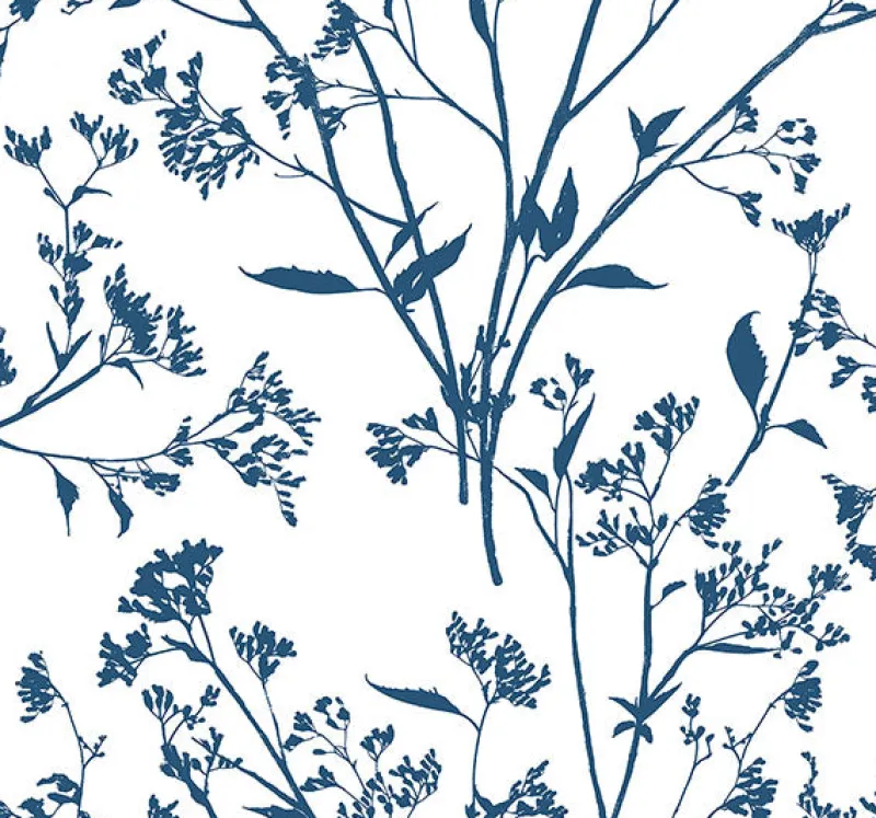 This simple and sophisticated botanical wallpaper will elevate the look of your home. The soft white background is covered by delicate blue branches with small, spindly leaves. Southport is an unpasted, screen acrylic coated wallpaper.