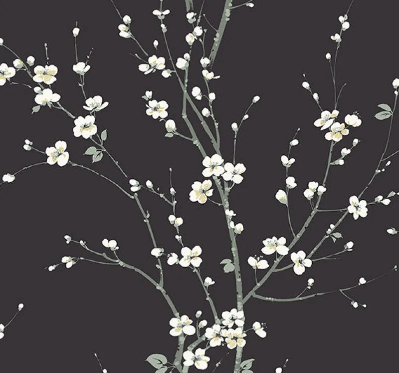 Simple yet striking, this floral wallpaper is an elegant accent for your home. The contrast between the matte black background with the spindly grey branches and tiny white blooms gives this delicate design dramatic flair. Monterey is an unpasted, screen acrylic coated wallpaper.