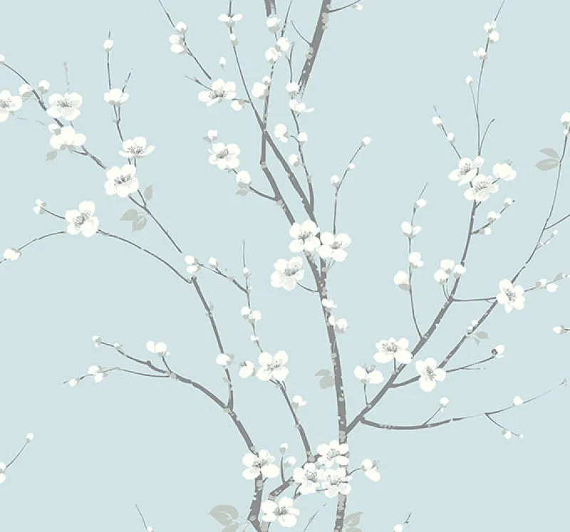 Delicate and demure, this floral wallpaper is simple elegance at its finest. Tiny white blooms bud along spindly grey branches that are outlined crisply against a soft sky blue backdrop. Monterey is an unpasted, screen acrylic coated wallpaper.
