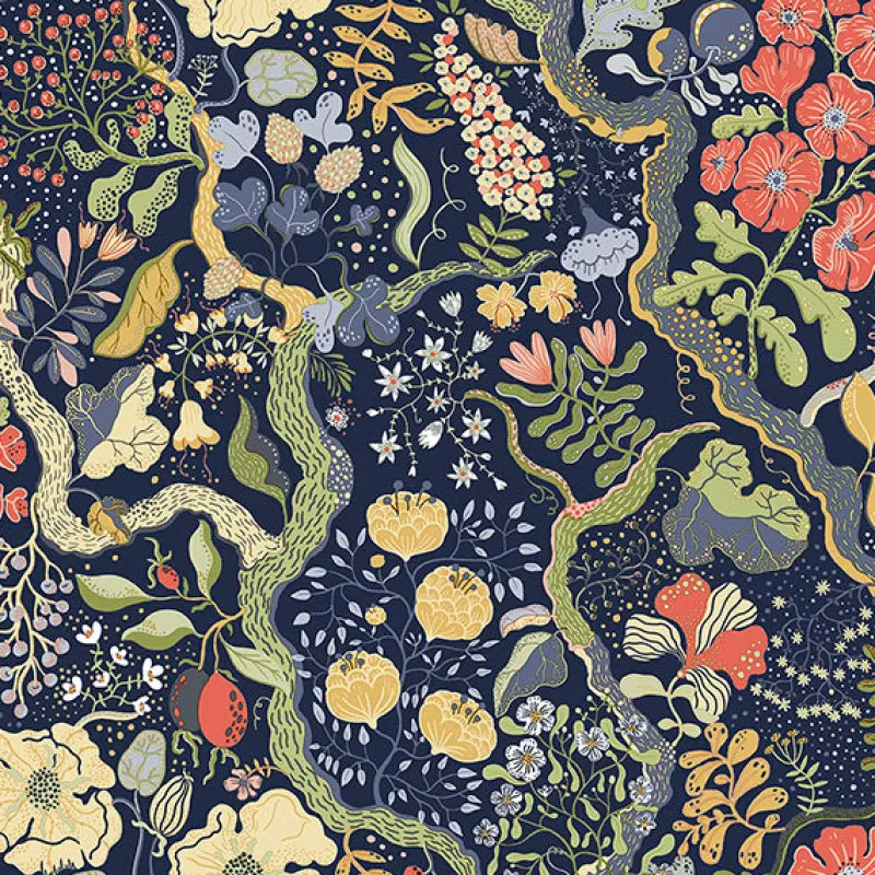 Revel in the beauty and abundance of nature with this vibrant floral wallpaper. This lush design features a multicolored medley of blossoms, berries, and thick vines set against a deep blue backdrop. Ann is an unpasted, non woven wallpaper.
