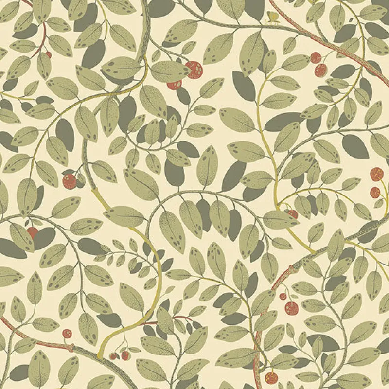 This charming vine wallpaper will transport you to a perfect, lazy summer day! The leaf-laden green vines house hidden moths and ripe red cherries, all offset by a creamy white backdrop. Kirke is an unpasted, non woven wallpaper.