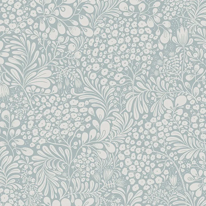 Add a splash of earthen tranquility to your walls with this gorgeous botanical design. Flowers, berries and leafy branches twine together, all inked in white against a powder blue background. Siv is an unpasted, non woven wallpaper.