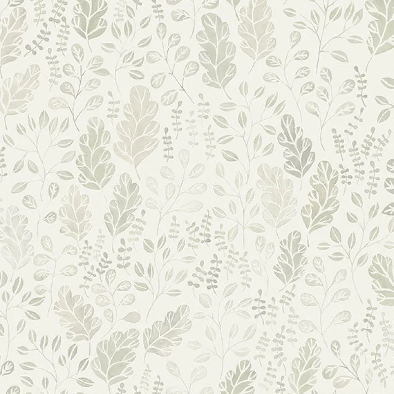 Subtle leaves saunter across a crisp white background in this charming wallpaper. Faded details and silhouette accents lend to its block print style. Isha is an unpasted, non woven wallpaper.