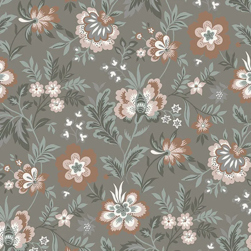 Grey and pink are a lovely pair in this painterly floral wallpaper. With a modern Jacobean edge, stunning blossoms curl about a rich taupe background. Athena is an unpasted, non woven wallpaper.