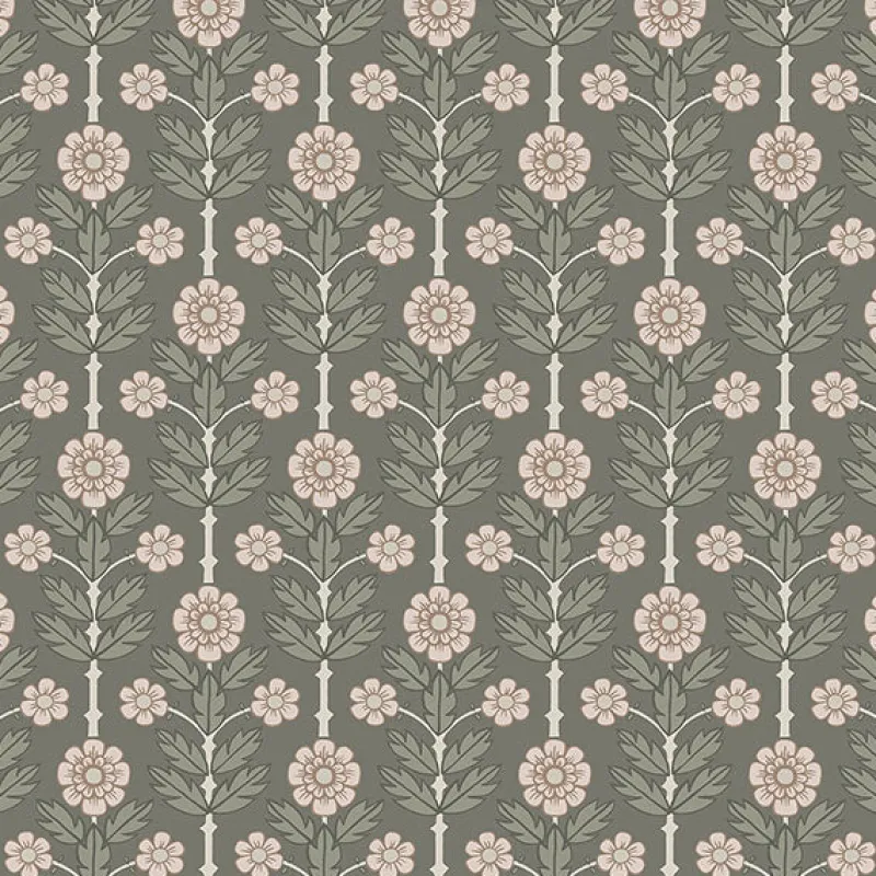 With delightful pink flowers, this botanical print has a whimsical feel. Its Scandinavian print effortlessly complements a grey background. Aya is an unpasted, non woven wallpaper.