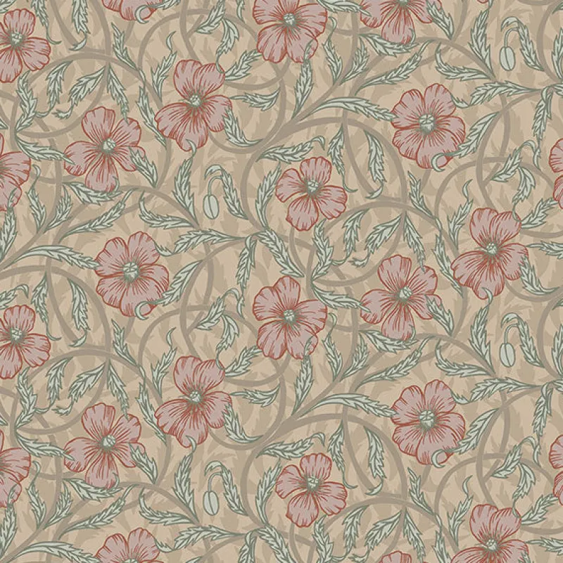 Ornate and beautiful, this eclectic wallpaper features blossoming flowers amongst curling geometrics. Its palette of beige, light brown and muted red emphasize its organic energy. Imogen is an unpasted, non woven wallpaper.
