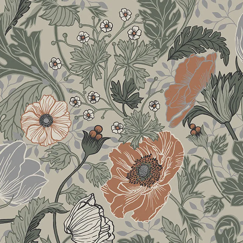 Transform rooms into an enchanted garden with this painterly floral wallpaper. Fluffy rust poppies and off-white tulips blossom amongst curling sage vines, while a light grey backdrop grounds the Scandinavian print. Anemone is an unpasted, non woven wallpaper.