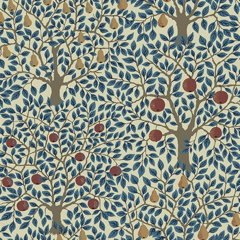Luscious yellow pears and red apples hang from sprawling trees in this nature inspired wallpaper. Its brilliant blue leaves will add a splash of color and whimsy to rooms. Pomona is an unpasted, non woven wallpaper.