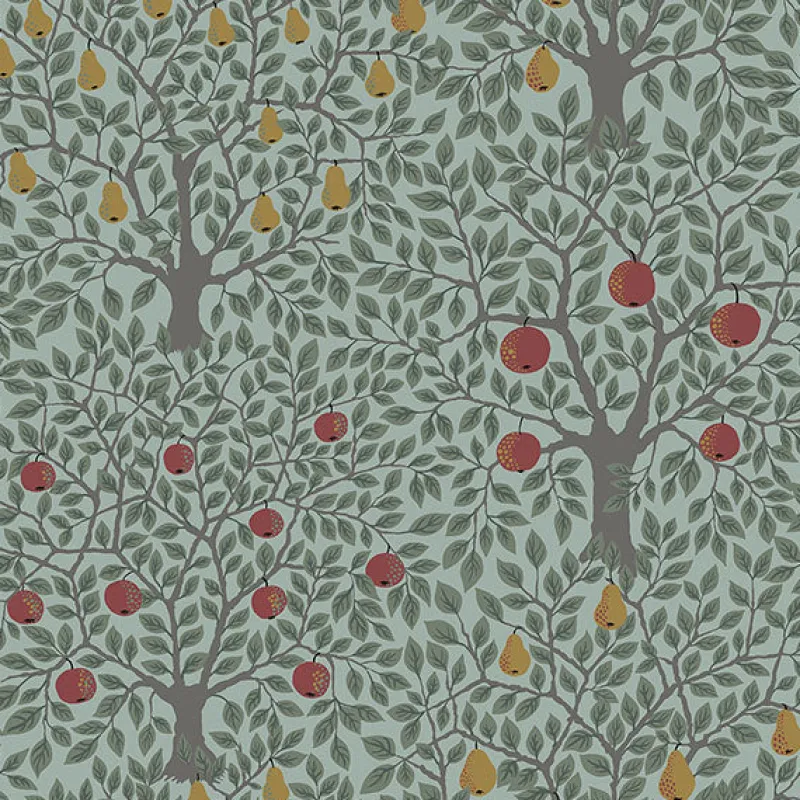 Lush with yellow pears and red apples, this nature inspired print has an eclectic charm. Its leafy trees and green palette emphasize its organic flair. Pomona is an unpasted, non woven wallpaper.